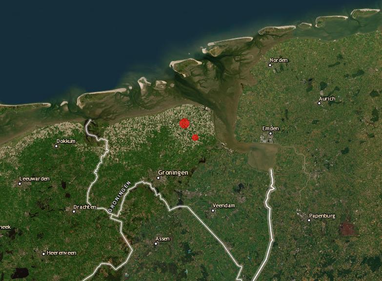 Im Norden der Niederlande ereignete sich heute Nacht um 00:16:39 UTC ein Erdbeben der Magnitude 3,2 , das Teile der niederländischen Provinz Groningen erschütterte. Das Epizentrum lag bei den Koordinaten 53.400° N, 6.722° E rund 23 km nordnordöstlich von Groningen und 13 km westnordwestlich von Appingedam. Das Hypozentrum wurde vom GFZ in einer Tiefe von 5 Kilometern festgestellt. Die Erschütterung war um 01:16 Uhr Ortszeit deutlich zu spüren und wurde von zahlreichen Bewohnern unmittelbar wahrgenommen. In den frühen Morgenstunden gab es ein zweites Beben Mb 2,0.
