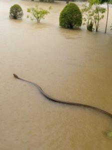 In den sozialen Medien geteilte Fotos zeigen nicht nur Überflutete Landschaften und Menschen, die auf Rettung warten, sondern auch allerlei Getier, dass mit den Fluten in die Siedlungen gelangte. Darunter diese Python.