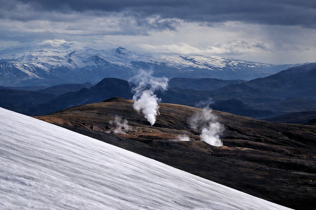 Das markanteste Merkmal von Hrafntinnusker ist der kleine Gletscher, der teilweise ein Geothermalfeld bedeckt. Das Zusammenspiel von Erdwärme und Eis hat faszinierende Eishöhlen geschaffen, aus denen dampfende Fumarolen austreten. Hrafntinnusker ist nur über einen ganztägigen Fußmarsch von Landmannalaugar aus erreichbar. Der Weg führt durch die bunte Rhyolith-Landschaft von Brennisteinsalda durch die Torfajökull-Caldera und eröffnet an klaren Tagen beeindruckende Blicke auf den Mýrdalsjökull mit der Katla.
