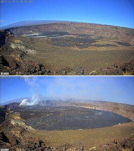 Besonders deutlich wird die Entwicklung im Vergleich von Webcam-Bildern: Zwischen Dezember 2024 und Dezember 2025 ist der Boden der Gipfelcaldera um mehr als 64 Meter angestiegen. Seit Beginn der neuen eruptiven Phase am 23. Dezember 2024 sind über 185 Millionen Kubikmeter Lava in den Halemaʻumaʻu geflossen – eine gewaltige Menge, die dennoch vollständig innerhalb der Caldera Platz findet. Am Rand der Caldera wächst zudem ein neuer Tephrahügel, der vor einem Jahr noch nicht existierte und die anhaltende explosive Aktivität einzelner Episoden widerspiegelt.