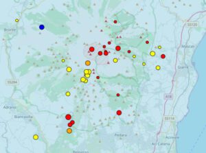 Auffällig ist ein kleiner Erdbebencluster mit Magnituden zwischen 1,2 und 1,8. Die Beben ereigneten sich am 15. Dezember zwischen Monte Nero und den Schipisten von Etna Sud. Einige Beben wurden in gleichem Tiefenbereich unter dem Valle del Bove festgestellt. Die flacheren Erdbeben im Gipfelbereich stammen von vergangener Woche und wurden bereits in meinem letzten Etna-Update thematisiert.