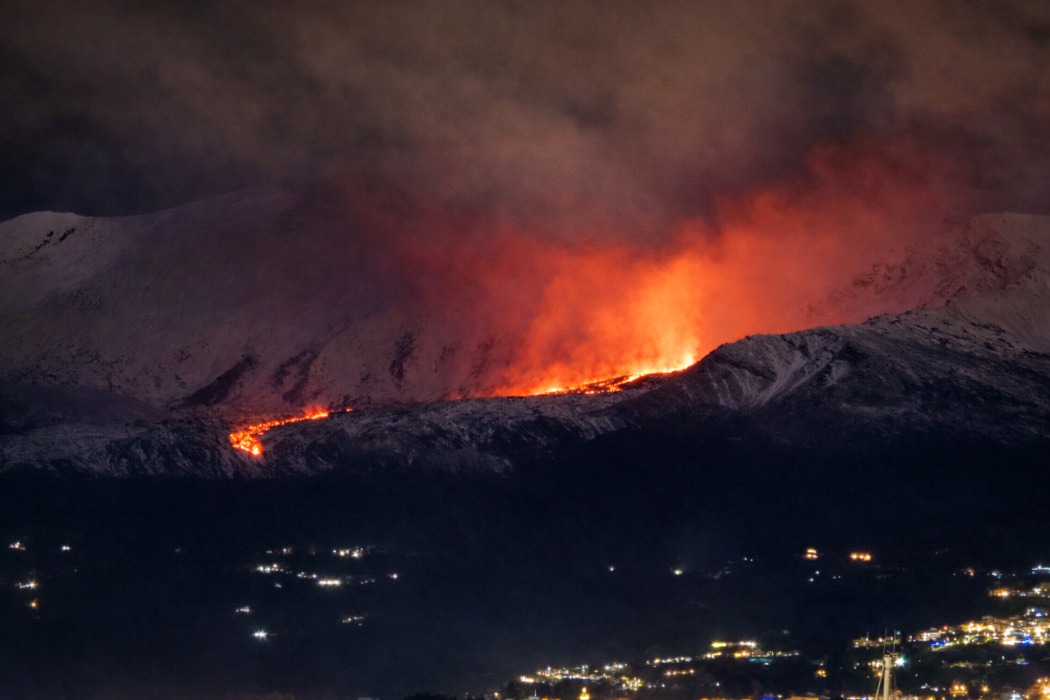 In der Silvesternacht öffnete sich eine Eruptionsspalte im unteren Bereich des Valle del Bove, nahe des Grates von Serracozo. Ein beeindruckender Lavastrom bewegt sich talabwärts und fließt in Richtung der Ortschaft Milo. Die Lavafront ist aber noch einige Kilometer vom Ort entfernt. Die Eruption begann still und leise und wurde erst anhand von Thermal-Satellitendaten entdeckt. Der Tremor bewegte sich im gelben Bereich.