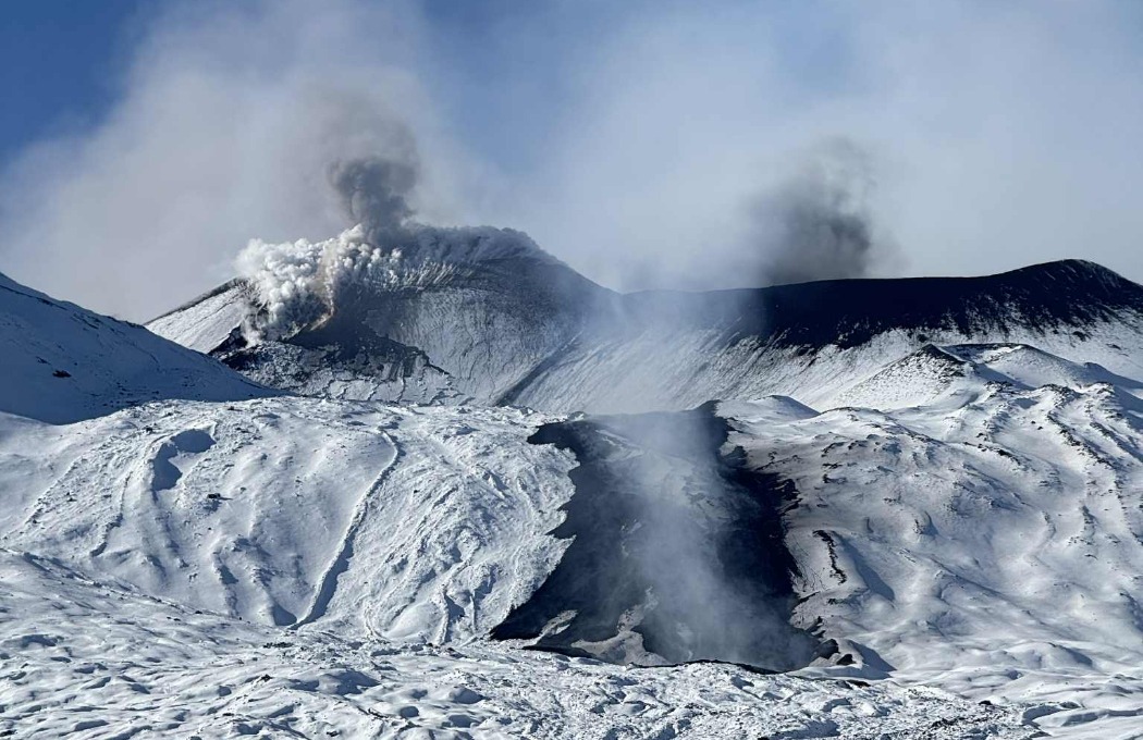 Neben der Aktivität am Nordostkrater – mit der in dieser Stärke auch die Experten nicht gerechnet haben – stimmten auch die Krater Bocca Nuova und Voragine mit ein. Aus letzterem Krater ergoss sich ein Lavastrom im oberen Teil des Valle del Bove bzw. Valle del Leone. Dieser Lavastrom kontrastiert schön mit der dicken Schneedecke. Das Foto stammt wieder von André Müller.