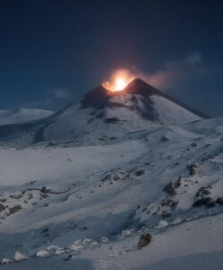 Nachdem es am Ätna in den letzten Wochen eruptionsmäßig eher still war, abgesehen von ein paar Ascheexhalationen vom Zentralkrater, wurden heute Livecamaufnahmen aus der Nacht veröffentlicht, die schwach strombolianische Eruptionen aus dem Südostkrater dokumentierten. Die hier gezeigte Aufnahme wurde von Galvagna Giuseppe gecaptured und via FB verbreitet.