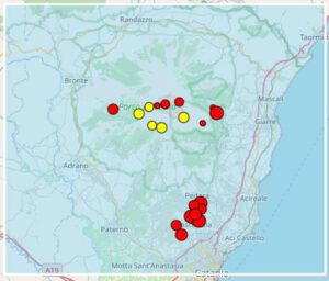 Gestern berichtete ich über die drei Erdbeben mit Magnituden im Zweierbereich, die sich an der unteren Südflanke des Ätnas zwischen Nicolosi und Pedara manifestierten, und mutmaßte, dass es weitere Erdbeben mit geringeren Magnituden gegeben haben könnte. Heute wurde die Ätna-Erdbebenkarte des INGV aktualisiert und es erschienen nicht nur die drei bereits beschriebenen Erdbeben, sondern noch 6 weitere Beben mit Magnituden zwischen 1,5 und 2,0. Es entstanden neue Risse im Asphalt vor einer Schule bei Tremestieri. Die Beben wurden vermutlich durch Spannungen an der Trecastagni-Tremestieri-Verwerfung verursacht.