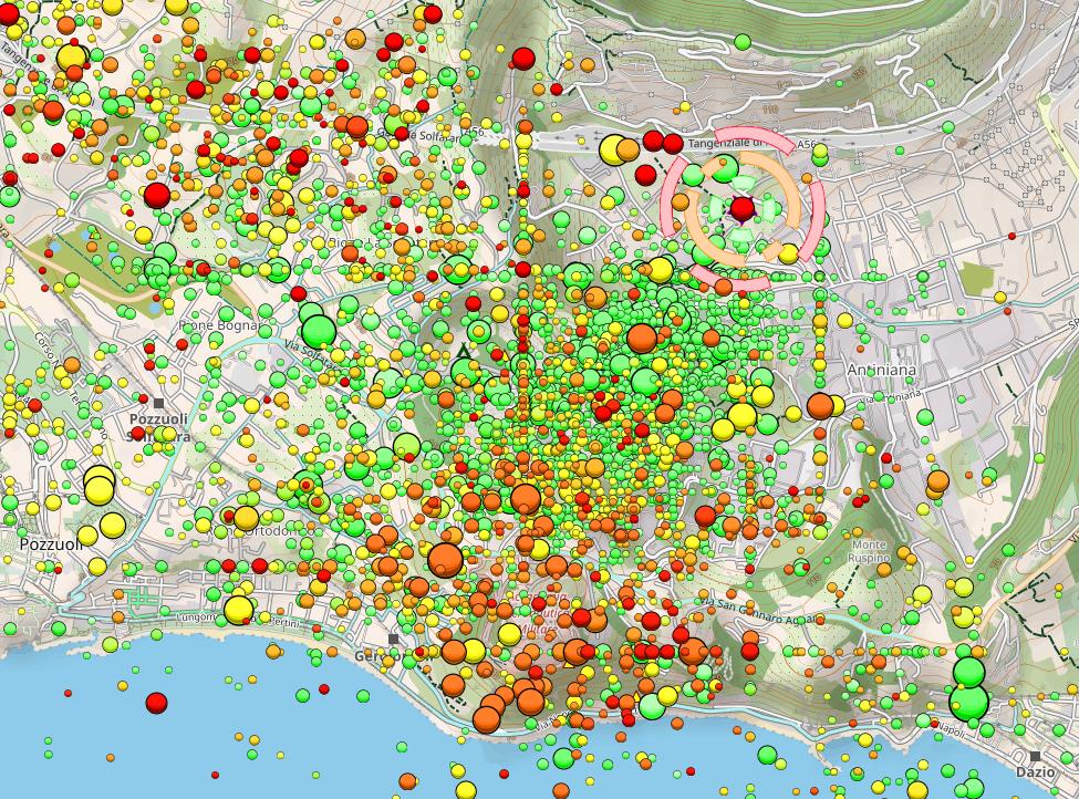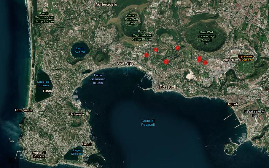 Update 03.10: Das Schwarmbeben hat an Intensität nachgelassen, doch auch am Morgen gab es weitere Erdbeben. Im letzten Update der Kommune Pozzuoli heißt es, dass das Schwarmbeben bislang aus 54 Beben bestand. Auf der GOSSIP-Shakemap vom INGV sind aber seit dem Morgen des 2. Oktobers mehr als 70 Beben verzeichnet. Mehrere Beben hatten Magnituden im Zweierbereich. Sie konzentrierten sich am Rand des Stadtteils Pisciarelli, nordöstlich der Solfatara und in relativer Nähe zur bekannten Fumarole. In dieser Region ist das Risiko phreatischer Eruptionen besonders groß.