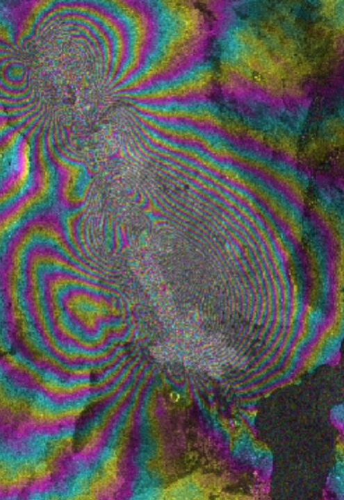 Eine InSAR-Aufnahme, die ich aus den Tiefen des Netzes gefischt habe und deren Datum oder Ursprung mir nicht bekannt ist, zeigt massive Bodendeformationen entlang der Erta-Alé-Kette. Die Bodendeformation lässt vermuten, dass die Eruption gestern erst der Anfang einer intensiven Eruptionsphase gewesen sein könnte.