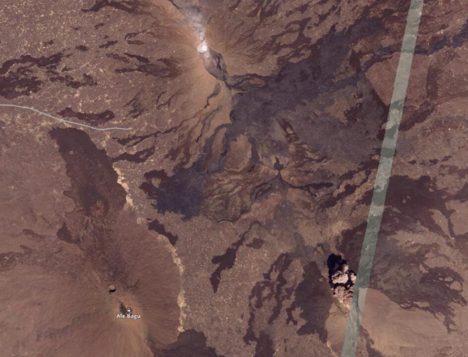 Als ich gegen 14 Uhr in die Berichterstattung einstieg, ging man davon aus, dass der Ale Bagu für die Eruption verantwortlich sei. Im Endeffekt liegen alle drei erwähnten Vulkane in einem Umkreis mit einem Radius von 7 Kilometern ausgehend von einem zentralen Punkt zwischen den Vulkanen und da war es für Augenzeugen in mehr als 50 Kilometern Entfernung schwierig, den genauen Eruptionsort zu bestimmen.