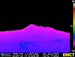 In einem heute Mittag veröffentlichten INGV-Bericht heißt es, dass entlang der am 1. Januar entstandenen Eruptionsspalten im Valle del Bove weiterhin mäßig viel Lava gefördert wird. Mehrere aktive Lavaströme sind im Bereich des Monte Simone zu beobachten. Die am weitesten vorgedrungenen Lavafronten liegen knapp unterhalb von 1900 bzw. 2000 m Höhe, während die weiter talabwärts gelegenen Bereiche des Lavafeldes inzwischen zum Stillstand gekommen sind und abkühlen. Nächtliche Kamerabeobachtungen zeigen anhaltende Leuchterscheinungen entlang der Spalten, was auf eine kontinuierliche Förderung hinweist.