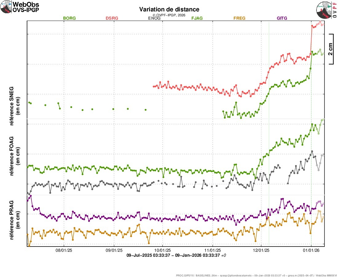 Besondere Bedeutung kommt den gemessenen Strain-Änderungen zu. Das Dehnungsmessgerät DRUV registrierte ab dem 7. Januar eine Phase rascher Kompression von rund 20 Nanodehnungen, gefolgt von einer langsamen Dekompression und einem derzeit oszillierenden Verhalten. Diese Kompression wird als Ausdruck einer Druckentlastung des magmatischen Speichersystems interpretiert. Durch den anhaltenden Abfluss von Magma über die Eruptionsspalten verliert das Reservoir Volumen, wodurch das umgebende Gestein leicht nach innen reagiert. Die fehlenden Veränderungen im GNSS-Netz unterstreichen, dass es sich um eine moderate, lokal begrenzte Deflation handelt. Insgesamt deuten die Daten auf eine stabile effusive Phase hin, ohne Hinweise auf eine bevorstehende Intensivierung der Aktivität.
