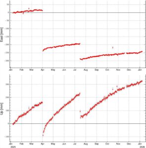 Auf der isländischen Reykjanes-Halbinsel hat sich die Bodenhebung bei Svartsengi in diesem Jahr wieder etwas beschleunigt. Ende Dezember zeigten die GNNS-Messwerte kurzzeitig eine Subsidenz an, wobei es sich wahrscheinlich ein weiteres Mal um Messungenauigkeiten gehandelt haben dürfte. Zeitgleich beschleunigte sich die Ostkomponente des horizontalen Versatzes, die auch jetzt noch erhöht ist. Das alles, bei weiterhin geringer Seismizität, was etwaige Prognosen zu einem möglicherweise bevorstehenden Vulkanausbruch erschwert.