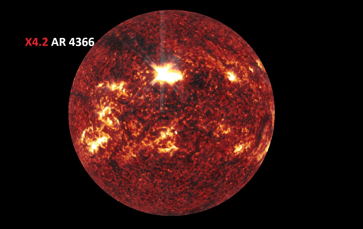 Die Sonnenfleckenregion AR4366 ist aktuell der Hauptmotor der Sonneneruptionen. Sie hat dutzende M-Klasse-Flares und mehrere X-Flares freigesetzt und gilt als magnetisch extrem komplex und energiegeladen.