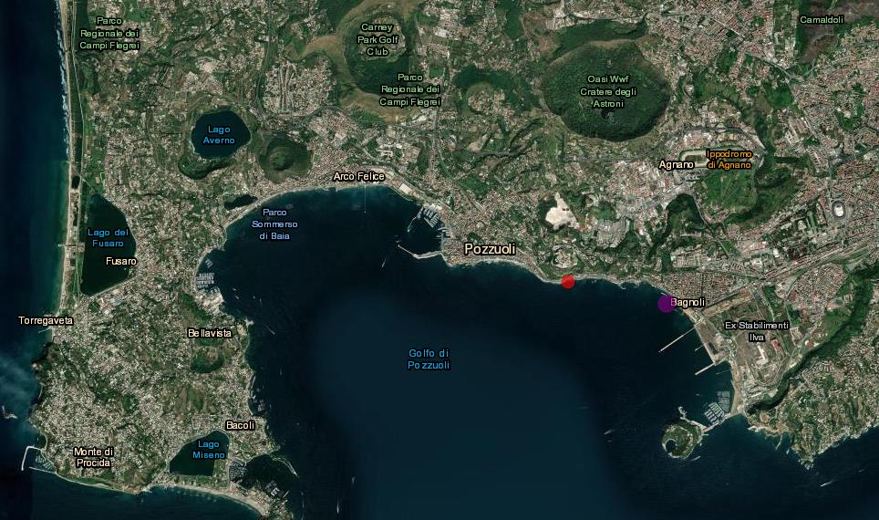 Die süditalienische Caldera Campi Flegrei wurde am Samstagabend um 18:55:10 Uhr Ortszeit von einem Erdbeben der Magnitude 3,0 erschüttert. Die Herdtiefe lag in 2,4 Kilometern. Das Epizentrum wurde unmittelbar vor der Küste bei Bagnoli verortet. Dem EMSC liegen mehrere Wahrnehmungsmeldungen vor, die sogar zum Teil aus dem benachbarten Neapel kamen. Demnach war der Erdstoß als starker Ruck deutlich spürbar und brachte in Hochhäusern Lampen zum Schwingen.
