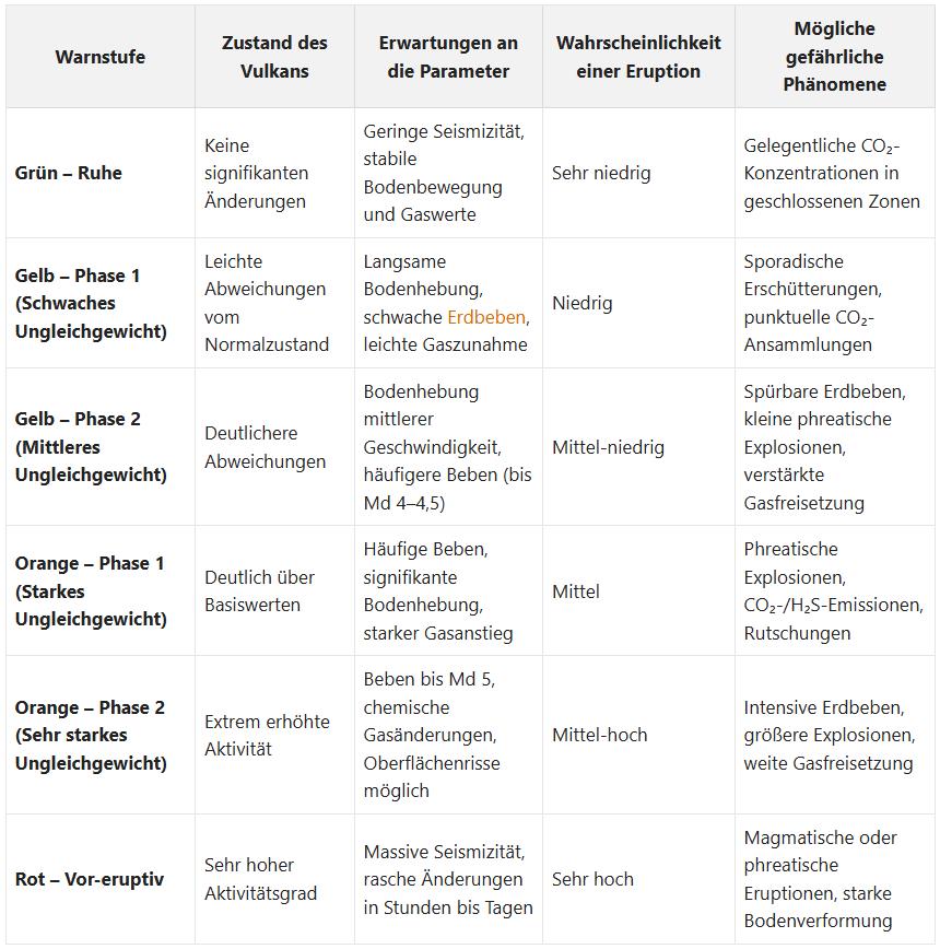 Während die Hauptfarben weiterhin den allgemeinen Zustand des Vulkans widerspiegeln, definieren die Phasen innerhalb jeder Farbe das Ausmaß der Veränderungen: Phase 1 kennzeichnet den Beginn einer Abweichung vom Normalzustand, Phase 2 steht für eine deutlicher ausgeprägte Aktivitätssteigerung innerhalb derselben Farbstufe.