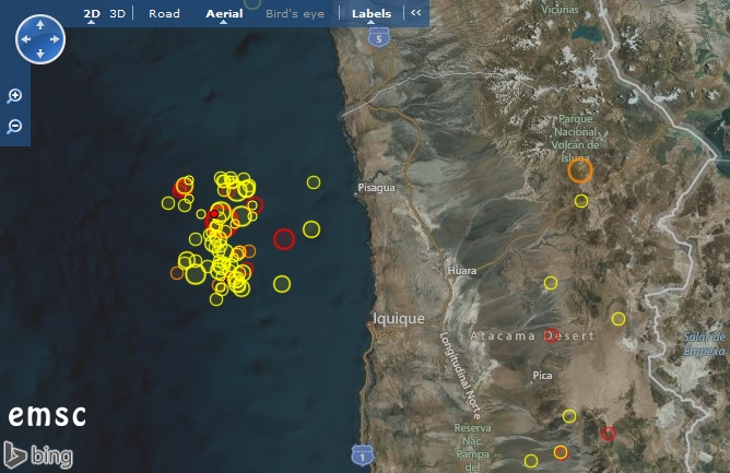 Vor der chilenischen Küste ereignete sich ein schweres Seebeben der Magnitude 8,2. Zur Tiefe des Bebens gibt es unterschiedliche Angaben: sie wird mit 46 km (USGS) und 20 km (EMSC) angegeben. Das Beben ereignete sich in der Küstenregion bei Tarapaca, 99 km nordwestlich der Stadt Iquique. Das Gebiet wurde in den vergangenen Wochen von zahlreichen Beben erschüttert. Das zeigt einmal mehr, dass starke Erdbeben auch auf einer Vielzahl schwächerer Beben folgen können. Es gab 4 Nachbeben mit einer Magnitude größer als 5.