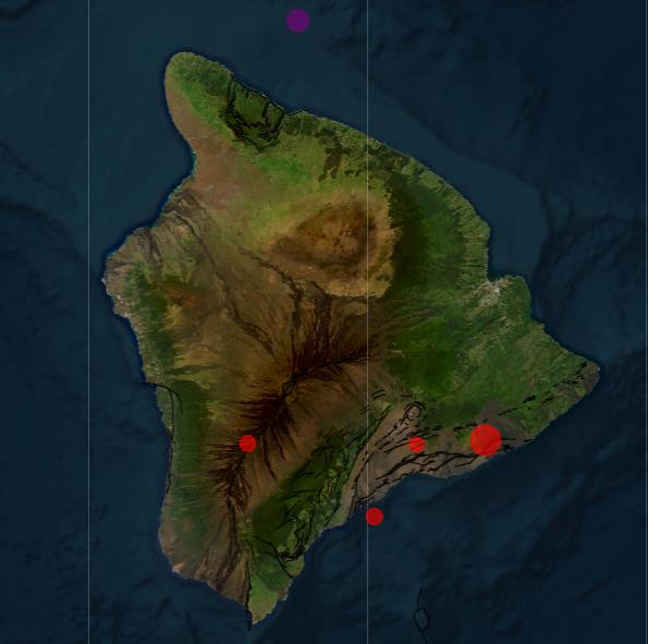 Wie ein Blick auf die Shakemap enthüllt, war dieses Beben nicht das einzige, das sich in den letzten 24 Stunden auf Big Island ereignete. Es gab mehrere schwächere Beben, vor allem im Süden der Insel. Das jüngste manifestierte sich nahe der Nordküste.