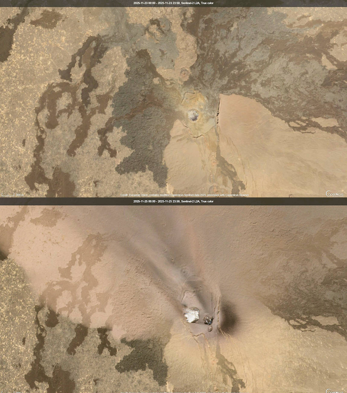 Vor wenigen Minuten veröffentlichte der europäische Copernicus-Dienst auf seiner frei zugänglichen Onlineplattform neue Satellitenbilder des Vulkans. Zu erkennen ist, dass bei der Eruption am Sonntag zwei neue Krater im Südosten der Gipfelcaldera entstanden sind. Sie sind unterschiedlich groß, und im Infrarotspektrum zeigt der kleinere Krater eine leichte thermische Anomalie. Im alten Hauptkrater steht eine Dampfwolke, wie sie bereits auf Satellitenfotos vor der Eruption zu sehen war.