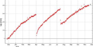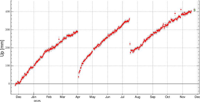 Meiner Einschätzung nach hat sich die Bodenhebung in den letzten Wochen zwar verlangsamt, aber wie man an dem Graphen zur Bodenhebung erkennen kann, entlud sich bei der letzten Eruption nicht das komplette Magmenreservoir und es verblieb einiges an Restschmelze im Magmenkörper. Daher ist der Druck im Magmenkörper bereits jetzt wieder auf hohem Niveau und ein Ausbruch sollte deutlich vor Februar einsetzen.