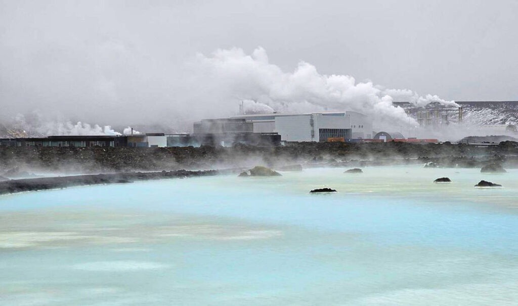 - Das Geothermalkraftwerk Svartsengi nutzt ein geothermales Reservoir, das in etwa 1–2 km Tiefe in porösen Basalten liegt.