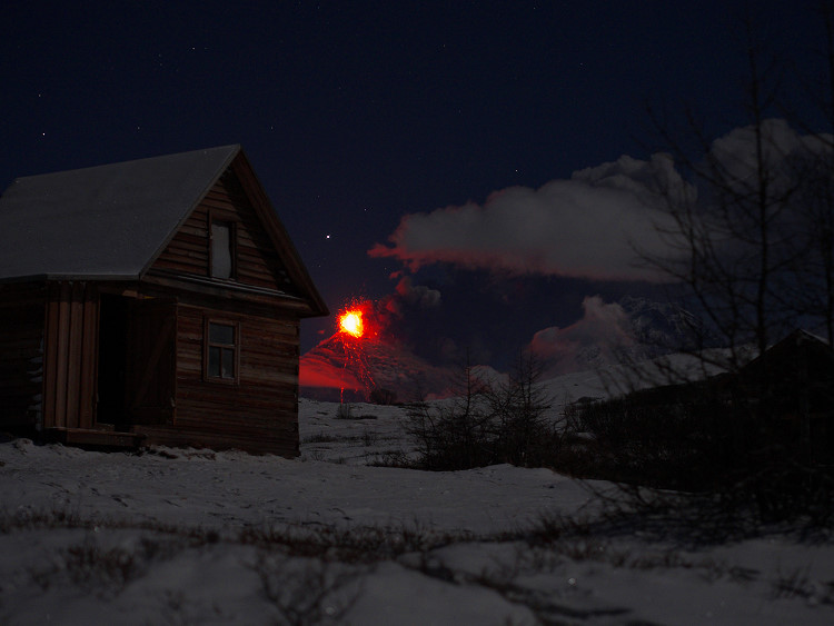 Die nächsten 2 Tage saßen wir in unserer Hütte fest. Nicht nur draußen tobte ein Schneesturm; Durch die Fugen der Hütte drang der Schnee bis in unsere Schlafstatt vor und bedeckte alles mit einer dünnen weißen Eisschicht. Im Inneren der Hütte herrschten frostige 7 Grad minus, draußen war es noch um einiges kälter. Obwohl wir vom Vulkan nichts sahen, hörten wir ihn scheppern. Der Ausbruch musste sich noch deutlich verstärkt haben. Zu sehen bekamen wir die Eruptionen erst wieder in der vierten Nacht auf dem Hochplateau. Uns erstaunte die Höhe der Lavafontäne, die gut 1000 m hoch aufstieg. Doch der Lavastrom versiegte langsam. Gegen Morgen ließ die Stärke der explosiven Eruption nach und uns dünkte, dass der Ausbruch seinen Zenit überschritten hatte. Aleksey brachte in Erfahrung, dass der Shiveluch große Aschewolken ausgespien hatte, und wir beschlossen, aufzubrechen, um diesen Vulkan früher als geplant anzusteuern.