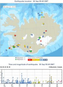 Einen anhaltenden Erdbebenschwarm gibt es auch beim Grjotarvatn unweit von Borganes bei Snaefellsnes. Dort manifestierten sich 22 Beben. Eine signifikante Bodenhebung gibt es hier momentan aber nicht.
