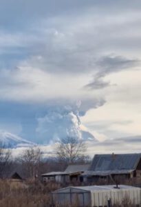 Videoaufnahmen zeigen den Klyuchevskoy in dichte Asche- und Dampfwolken gehüllt, die auch vom unteren Hang des Vulkans aufsteigen – ein weiteres Indiz für einen Lavastrom, der auf der Vulkanflanke unterwegs ist und mit dem Schnee auf der Flanke interagiert.