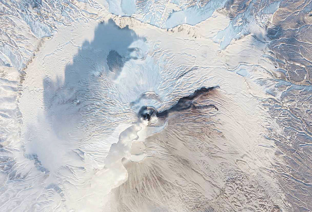 Am Abend des 15. November zeigten Beobachtungen, dass der Ausbruch weiterhin anhält und Lava aktiv den Osthang des Vulkans hinabfließt. Auf Sentinel-Satellitenaufnahmen lässt sich die Wärme der Lavaströme im Infrarotspektrum visualisieren. Die Aufnahme oben zeigt den Vulkan im sichtbaren Lichtspektrum, in dem der zweiarmige Lavastrom zu sehen ist, der in Richtung Nordosten fließt. Zu erkennen ist auch, dass sich im Südosten des Vulkans feine Ascheablagerungen auf dem Schnee bildeten. Im Infrarotspektrum erkennt man zudem eine thermische Anomalie im Kraterbereich des Krascheninnikow. MIROVA registriert eine moderate bis hohe Thermalstrahlung, die gestern eine Leistung von fast 160 MW erzeugte.