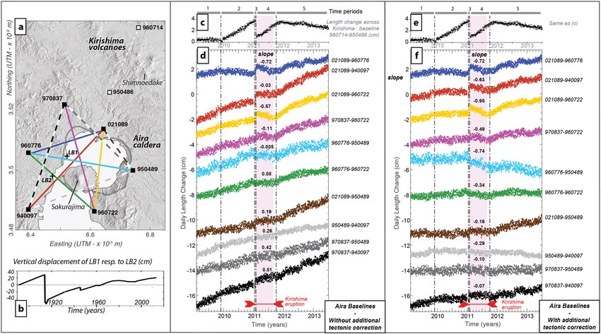 Die neue Studie analysierte geodätische Messungen aus den Jahren um die Shinmoedake-Eruption von 2011. Zu dieser Zeit war auch der Sakurajima sehr aktiv. Computermodellierungen der Daten lieferten ein Ergebnis, das ebenso erstaunlich wie eindeutig ist: Während das Kirishima-System im Jahr 2011 schlagartig Magma freisetzte und inflationäre Bodenhebung zeigte, setzte in der Aira-Caldera fast zeitgleich eine deutliche, zuvor Deflation ein und der Boden, der sich zuvor 20 Jahre lang gehoben hatte, begann sich zu senken. Die Forscher schlussfolgern daraus, dass beide Systeme durch ein gemeinsames tiefes Reservoir verbunden sein könnten. Magma scheint – zumindest episodisch – zwischen den Vulkanen „umzupumpen“, was bedeutet, dass Aktivität an einem Vulkan unmittelbare Auswirkungen auf den anderen haben kann.