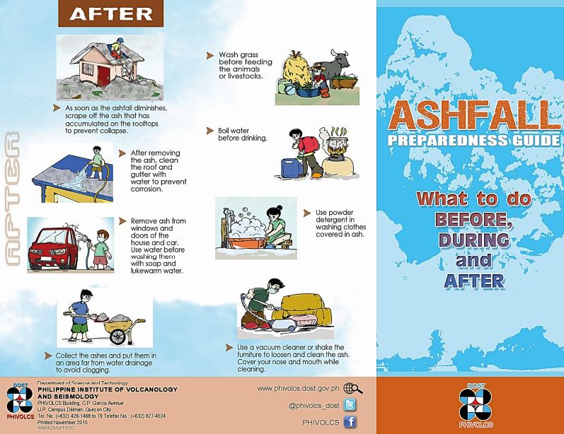 Die anhaltenden Ascheemissionen beeinträchtigen das Leben der Menschen in Vulkannähe. Es kam bereits zu Evakuierungen von Anwohnern, die sich innerhalb der 6-Kilometer-Sperrzone befanden. PHILVOLCS und der Zivilschutz überarbeiteten nun die Empfehlungen für das richtige Verhalten der Bevölkerung, die bereits seit 2015 gelten, und stellten sie in einem 2-seitigen Schaubild (von dem ich hier nur die erste Seite bringe) anschaulich dar. So wird z.B. empfohlen, Vulkanasche von Hausdächern zu fegen und von Autos mit viel Wasser abzuspülen. Offen gelagertes Trinkwasser solle man abkochen, wobei mir nicht so ganz klar ist, wie das gegen Asche helfen soll. Filtrieren wäre hier wohl angebrachter.