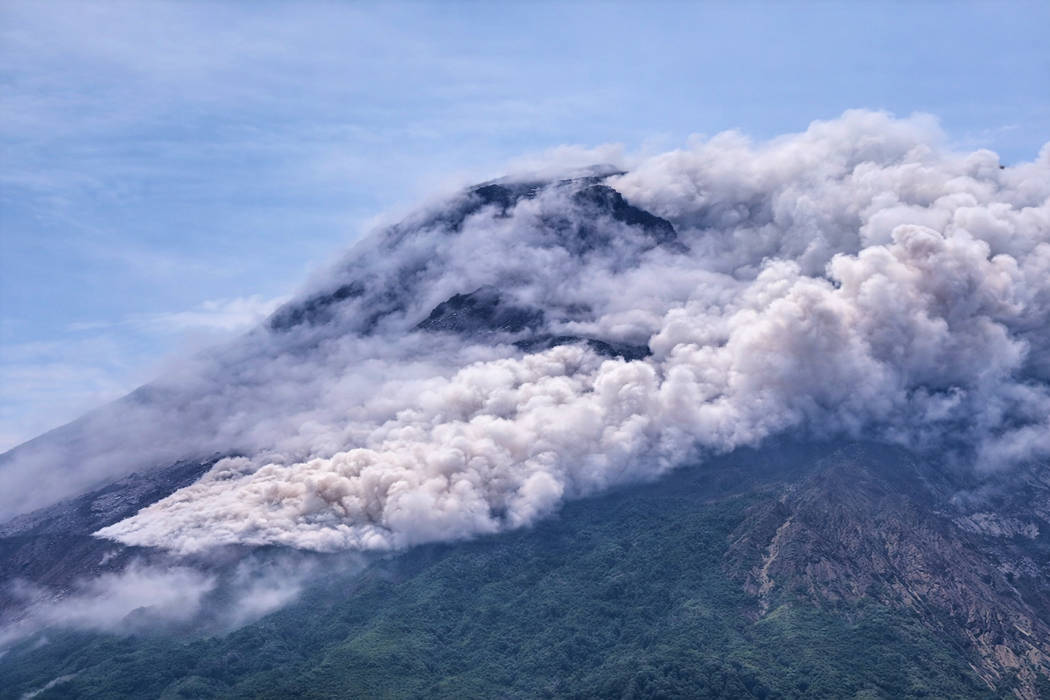 Am Mount Merapi auf Java ist gestern erneut ein pyroklastischer Strom abgegangen. Dabei handelt es sich um eines der gefährlichsten Phänomene dieses Vulkans. Die Messstationen registrierten ein entsprechendes Erdbebensignal mit einer Amplitude von 16 Millimetern und einer Dauer von 151 Sekunden. Solche Signale entstehen, wenn heißes Gas, vermengt mit Asche und Gesteinsmaterial, infolge eines Domkollapses mit hoher Geschwindigkeit die Flanken des Vulkans hinabströmt Doch eine große Gefahr bestand nicht, denn es handelte sich um einen kleineren pyroklastischen Strom auf der Südwestflanke, der innerhalb der ausgewiesenen Sperrzone blieb. Dennoch verdeutlicht dieses Phänomen die weiterhin angespannte Lage.