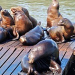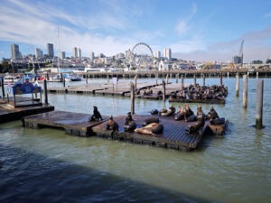 Der vergleichsweise günstige Direktflug mit Condor von Frankfurt nach San Francisco erfolgte ereignislos, auch wenn Bordprogramm und Verpflegung stark zu wünschen übrig ließen und mir der Magen bei der Ankunft in den USA knurrte. Entgegen meinen Befürchtungen verlief die Immigration ohne ungewöhnliche Kontrollen – Trumps Finger reichen wohl nur bedingt bis in das weltoffene Kalifornien. Da wir erst am späten Nachmittag ankamen, verbrachten wir die erste Nacht in einem Hotel in San Bruno nahe des Flughafens. Dummerweise konnten wir unser gemietetes Wohnmobil erst am Nachmittag des Folgetags in Empfang nehmen und so fuhren wir vormittags mit einem Uber nach San Franzisco hinein, wo wir zuerst Fisherman’s Wharf und den Pier 39 besichtigten, der für seine Seelöwen und die gastronomische Meile bekannt ist. Nach einem Fotoshooting mit den Seelöwen gönnten wir uns hier ein Frühstück und machten uns auf den Weg zum Coit Tower, der erhöht auf einem der Hügel liegt, für die die Straßen von San Franzisco so berühmt sind. Mit dem Aufzug fuhren wir in die oberste Etage, von wo aus wir uns einen schönen Überblick über die Stadt verschaffen konnten.