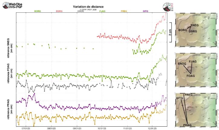 Begleitend zu den Erdbeben zeigt sich eine fortschreitende Aufblähung des Vulkans. GPS-Messungen seit Ende November verzeichnen eine Ausdehnung der Gipfelfläche um etwa 2,5 bis 3 Zentimeter, was ebenfalls auf eine Druckzunahme im Magmasystem hindeutet. Gasemissionen am Gipfel bleiben niedrig und liegen nahe der Nachweisgrenze, was typisch für Dampfimpulse aus dem hydrothermalen System ist.