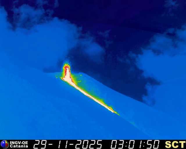 Wie das Ätna-Observatorium des Nationalen Instituts für Geophysik und Vulkanologie (INGV) heute Nacht meldete, registrierten Überwachungskameras den Lavaausbruch gegen 00:35 UTC. Dabei bildet sich ein Lavastrom im oberen Abschnitt der Sciara del Fuoco, der durch eine tiefe Rinne abfloss, die praktisch nur von der Seeseite aus einsehbar ist. Der Ausbruch wurde durch einen anhaltenden Lavafluss aus mindestens zwei Öffnungen im Nordkraterbereich gespeist. Die strombolianische Tätigkeit ging auch während der effusiven Eruptionsphase weiter. Der Lavaüberlauf ist inzwischen wieder beendet.