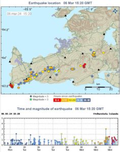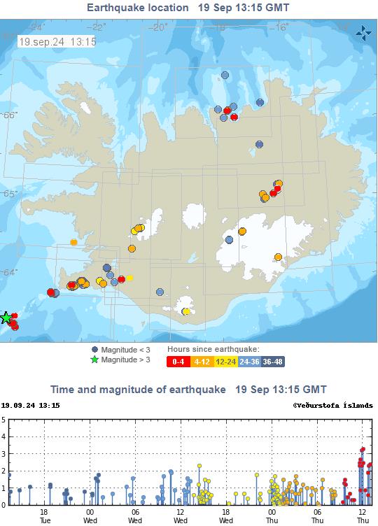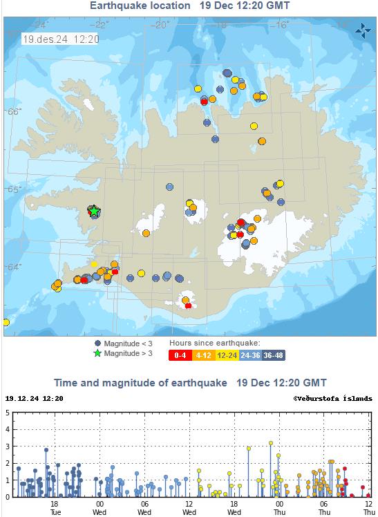 Auf der isländischen Reykjaneshalbinsel gibt es auch am K-Freitag zahlreiche Erdbeben: In den letzten 48 Stunden wurden vom seismischen Netzwerk 207 Erschütterungen festgestellt. Die meisten manifestierten sich entlang des magmatischen Gangs und seiner Grabenbrüche, die sich im Zuge der Intrusion und Eruption zwischen dem 1. und 3. April entlang der Sundhnúkur-Kraterreihe gebildet haben, wobei der Gang auch über den Verlauf der Kraterreihe hinausschoss. Aber nicht nur dort bebte es, sondern auch am benachbarten Risssystem des Fagradalsfjall, das ja der erste Brennpunkt der Aktivität auf Reykjanes zwischen 2021 und 2023 war.