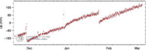 Interessanterweise gab es im Zuge der Gangintrusion eine signifikante Bodenhebung nördlich des Fagradalsfjall. Leider ist das Messnetzwerk in diesem Areal sehr ausgedünnt, so dass es schon fast als unbrauchbar zu bezeichnen ist, aber es ist nicht ausgeschlossen, dass sich auch jetzt noch Magma im Bereich zwischen Fagradalsfjall und Keilir akkumuliert. Die neusten Messungen bei Svartsengi deuten auf einen Rückgang der Hebegeschwindigkeiten des Bodens hin, wobei es sich hier auch um die viel zitierten Messungenauigkeiten infolge von Bahnabweichungen der Satelliten handeln könnte. Die nächsten Tage werden zeigen, ob es tatsächlich einen weiteren Trend zur Verlangsamung der Hebegeschwindigkeit des Bodens gibt.