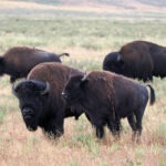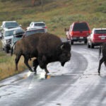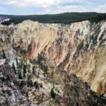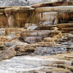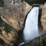 Am späten Vormittag ging es weiter in den Norden des Parks, wo wir nach ca. 45 Minuten ankamen und den Mammoth Hot Springs einen Besuch abstatteten. Ich wundere mich immer wieder über die Dynamik von Kalksinterterrassen: Dort, wo vor ein paar Jahren noch blau schimmernde Wasserbecken waren, herrschte jetzt Trockenheit vor, die vom grellen Weiß des Kalks dominiert wurde. Dafür waren andere Terrassen aktiver als früher. Nach einem schnellen Mittagessen ging es zurück, vorbei an Norris und Richtung Westen zum Grand Canyon of the Yellowstone und seinen beiden beeindruckenden Wasserfällen. Vorher meinte ich noch zu Leroy: „Wenn wir irgendwo Bisons sehen, dann im weiten, grasbestandenen Hayden-Valley, das kurz vor dem Canyon liegt.“ Und tatsächlich, hier grasten sie, die langersehnten Bisons. Leider hatte es gerade zu gewittern angefangen und das Fotolicht war mies. Zudem gerieten die Ranger in Panik, als ein paar Bisons die Straße überquerten, und vermiesten die Stimmung zusätzlich, aber immerhin hatten wir ein paar leckere Steaks identifiziert.