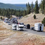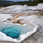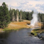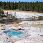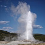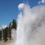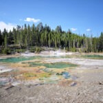 Als erstes Thermalgebiet besuchten wir das Lower Geyser Basin mit dem Fountain Paint Pot und dem Great Fountain Geyser. Am Midway-Geyser-Basin, wo sich die beliebte Grand-Prismatic-Spring befindet, standen wir unvermittelt im Stau, was mich doch ziemlich verwunderte, denn so ein Verkehrsaufkommen kannte ich von früher nicht. Der Stau bildete sich, weil alle Parkplätze am Midway Geyser Basin belegt waren, also vertagten wir eine Besichtigung des größten Thermalpools auf den nächsten Tag und passierten das gesperrte Biscuit Basin, wo sich im Vorjahr die große hydrothermale Explosion ereignet hatte. Bevor es zum Old Faithful ging, stoppten wir noch am Black Sand Basin mit dem ständig sprudelnden Cliff-Geysir und dem Emerald Pool.
