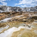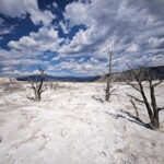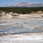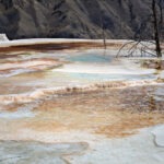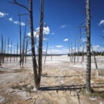 Aufgrund der Erfahrungen mit den überfüllten Parkplätzen an einigen der Hauptattraktionen des Parks waren wir bereits zum Sonnenaufgang wieder on the road und klapperten die Geyser-Basins ab. Einen ersten Stopp legten wir an der Grand Prismatic Spring ein, wo wir früh morgens zwar noch problemlos einen Parkplatz bekamen, aber vor lauter Dampf nichts sahen. Zu groß war der Temperaturunterschied zwischen dem heißen Wasser und der kalten Morgenluft. Also mussten wir hier noch ein anderes Mal wiederkommen und fuhren zum Norris-Geyser-Basin weiter. Norris ist meiner Meinung nach eines der spannendsten Thermalgebiete des Yellowstone, nicht zuletzt weil es hier während der letzten Krise, die vor 10 Jahren endete, die stärksten Bodenhebungen gegeben hatte: Innerhalb von 2 Jahren hatte sich der Boden um 50 mm gehoben und es waren mehrere neue Quellen und Fumarolen entstanden. Zudem stieg die Fluidtemperatur an. Manche unkten schon einen bevorstehenden Supervulkanausbruch herbei, doch auch jenseits solcher Superlative war es eine spannende Zeit. Zuletzt war es der Steamboat-Geysir, der für Aufsehen sorgte, indem er ungewöhnlich häufig sprang. Doch diese Phase scheint in diesem Frühjahr endgültig ausgelaufen zu sein und so sahen wir den weltgrößten Geysir nur dampfend rumsprotzen. Doch ein morgendlicher Spaziergang über die Holzstege war auch ohne großen Sprung ein Erlebnis. Besonders angetan hat mich das bunt schillernde und dampfende Porcelain Basin, wo ich ein Weilchen zum Fotografieren verweilte.