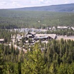 Am Upper Geyser Basin mit dem berühmten Old Faithful traf mich dann der Schlag, wegen der Dimensionen, auf denen Parkplatz und Tourismuszentrum hier angewachsen waren. Aber klar, fast eine Million Besucher pro Monat wollen irgendwo parken und untergebracht sein. Als ich 1991 zum ersten Mal hier war, zählte man eine Million Besucher pro Jahr und war noch stolz darauf! Inzwischen ist der Massentourismus eher zu einem Problem geworden. Mit dem Besucheransturm bei gleichzeitigem Trumpschen Personalabbau in den Nationalparks und an anderen Stellen des öffentlichen Dienstes seines gehassten Deep States haben leider auch Sauberkeit und Qualität des Angebotes nachgelassen. Zwar gab es am Upper Geyser Basin keinen Parkplatzmangel, dafür war die berühmte Yellowstone-Lodge arg runtergekommen und dreckig, das Essen von zweifelhafter Qualität und selbst ein Snack völlig überteuert. Neben der Lodge gibt es hier noch das Visitor-Center, wo die Prognosen zu den Sprungzeiten der bekanntesten Geysire angezeigt werden, und das Old Faithful Inn, wo man teurer, aber besser essen gehen kann als in der Lodge. Wer länger im Park unterwegs ist, kommt kaum an den Lodges in den verschiedenen Parkbereichen vorbei, denn die Wege im Park sind lang.