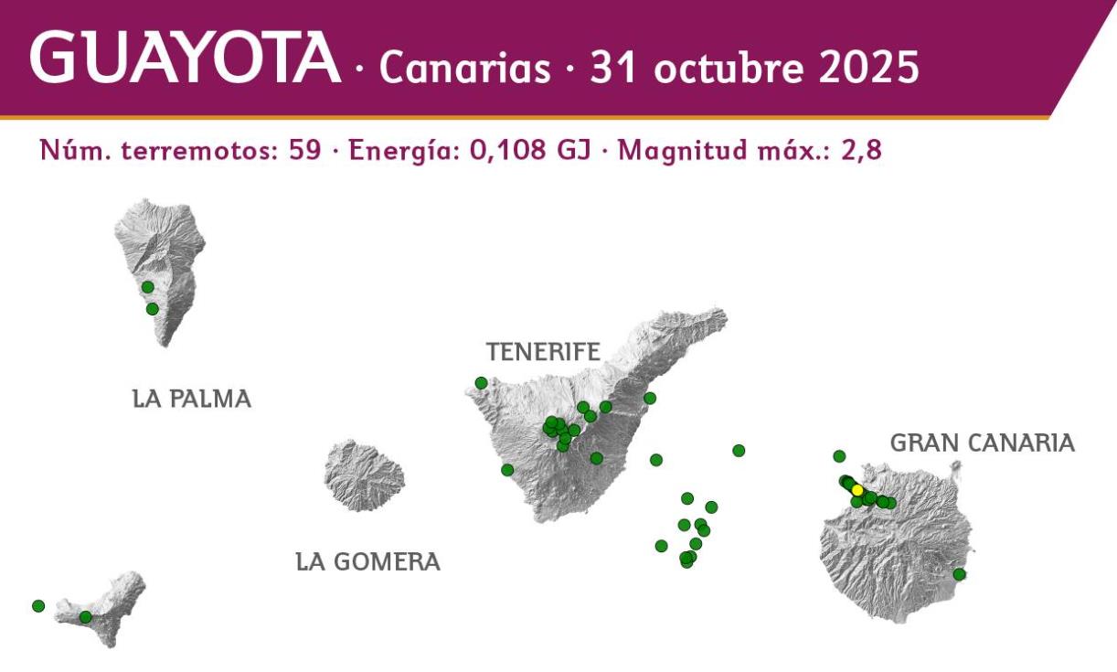 In der vergangenen Woche registrierte das kanarische seismische Netzwerk von INVOLCAN insgesamt 59 schwache Erdbeben, deren stärkstes eine Magnitude von 2,8 erreichte. Dieses ereignete sich am Donnerstag, 30. Oktober 2025, an der Nordwestküste von Gran Canaria und war Teil des erwähnten Schwarmbebens. Dieses setzte sich aus mehr als 20 Beben zusammen, die in der Shakemap und der Statistik des Guayota-Berichts nicht alle vorkommen.
