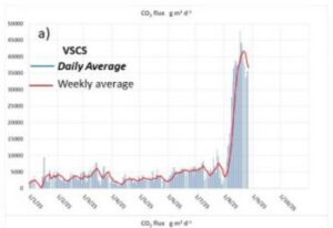 Der Schwefeldioxidausstoß am Krater steigt leicht auf ca. 70 Tonnen am Tag. Zudem erhöhten sich auch die Temperatur der Fumarolen, die nun alle 291 Grad Celsius heiß sind, was ebenfalls ungewöhnlich ist, weil die Fumarolen entlang des Schwefelfelds in den verschiedenen Sektoren unterschiedlich heiß waren. Zuletzt gingen die Temperaturen zurück und lagen bei maximal 280 Grad.