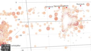 Schaut man sich die Lage der Erdbeben in der von Mike entdeckten 3D-Grafik an, dann erkennt man, dass sich das Magma in einer Tiefe zwischen 5 und 10 km seitwärts auszubreiten scheint und sich dort ein Magmenkörper nicht nur in Richtung Keilir ausdehnt, sondern weit darüber hinaus. Der magmatische Gang könnte demnach über 10 km lang sein und somit doppelt so groß wie vor der Eruption 2021.