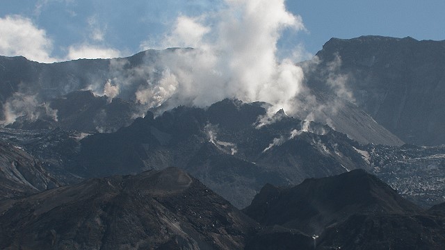 In diesem Krater wächst ein neuer Lavadom. Das Wachstum erfolg periodisch und gelegentlich entstehen Ashfall und Schuttlawienen.
