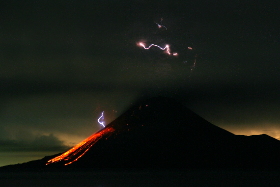 | Gegen so einen Riesenvulkan erscheint der 400 m hohe Anak-Krakatau wie ein Zwerg. Wissenschaftler halten einen katastrophalen Ausbruch z.Z. für sehr unwahrscheinlich. Ein selten fotografiertes Phänomen sind Blitze in der Eruptionswolke. © Marc Szeglat |