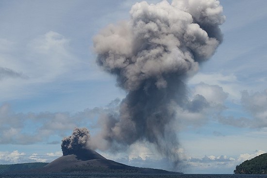 | Schon von Weitem wurde ich vom "Kind des Krakatau" begrüßt. Im Schnitt kam es alle 40 Minuten zu einer Explosion und die Aschewolke stieg bis zu 1 Kilometer hoch auf. Es regnete Asche über dem südchinesischen Meer. © Marc Szeglat |