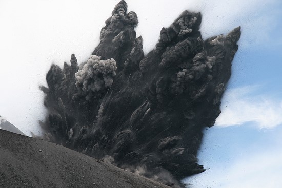 | Zum Beginn der neuen Eruptionsphase waren die Ausbrüche stärker und von phreatischer Art. Hinzu kamen strombolianische Eruptionen die rotglühendes Material förderten. Im Januar fehlten diese beiden Komponenten und es gab rein magmatische Ausbrüche, die nur wenig glühendes Material förderten. Dennoch waren vereinzelte Explosionen besonders kraftvoll und Lavabrocken flogen bis ins Meer. © Marc Szeglat |
