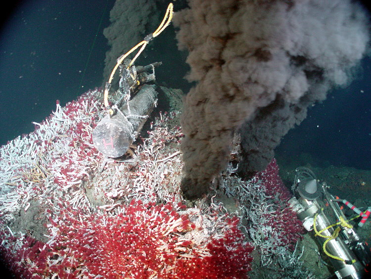 Rund um die hydrothermalen Schlote hat sich eine bizarre Lebensgemeinschaft angesiedelt, die in ewiger Dunkelheit, völlig unabhängig von photosynthetischer Energie, existieren kann. Schwefelwasserstoff ist die Grundlage für das Leben in den hydrothermalen Feldern. Er entsteht, wenn Sulfat aus dem Meerwasser mit zweiwertigem Eisen unter Bildung von Schwefelwasserstoff und Oxiden dreiwertigen Eisens reagiert. Bakterien, die ihren Energiebedarf durch die Oxidation von Schwefelwasserstoff decken, stehen am Anfang der Nahrungskette. Sie resorbieren Schwefelwasserstoff und Sauerstoff aus dem Meerwasser. Sulfid und Sauerstoff verbinden sich zu Sulfat. Die dabei freiwerdende Energie hält den Bakterienstoffwechsel aufrecht. Eine Lebensgemeinschaft entsteht, die ihre Existenz dem Vulkanismus verdankt.